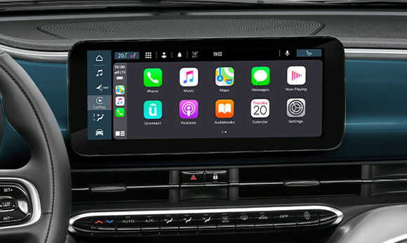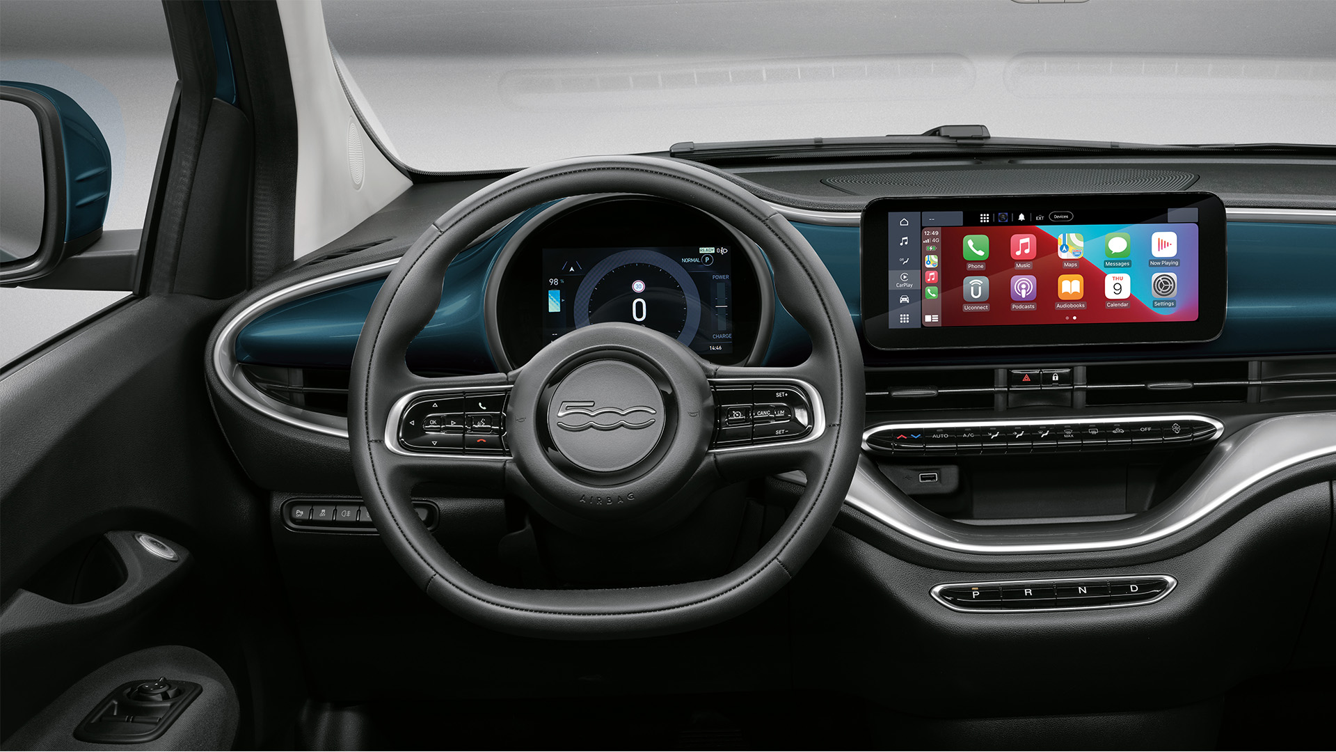 Jaunā Fiat 500 La Prima by Bocelli elektriskā versija ir saderīga ar Apple CarPlay™. Vienkārši savienojiet savu iPhone ar Uconnect™ 10,25" skārienekrānu un vadiet Apple CarPlay™, izmantojot Siri balss vadības funkciju vai automobiļa skārienekrānu. Bezvadu Apple CarPlay™ ir viedākais un drošākais veids, kā izmantot savu iPhone tālruni automobilī. Varat saņemt navigācijas norādes, veikt zvanus, sūtīt un saņemt ziņas un klausīties Apple Music, audiogrāmatas vai podkāstus, vienlaikus koncentrējoties uz ceļu.
